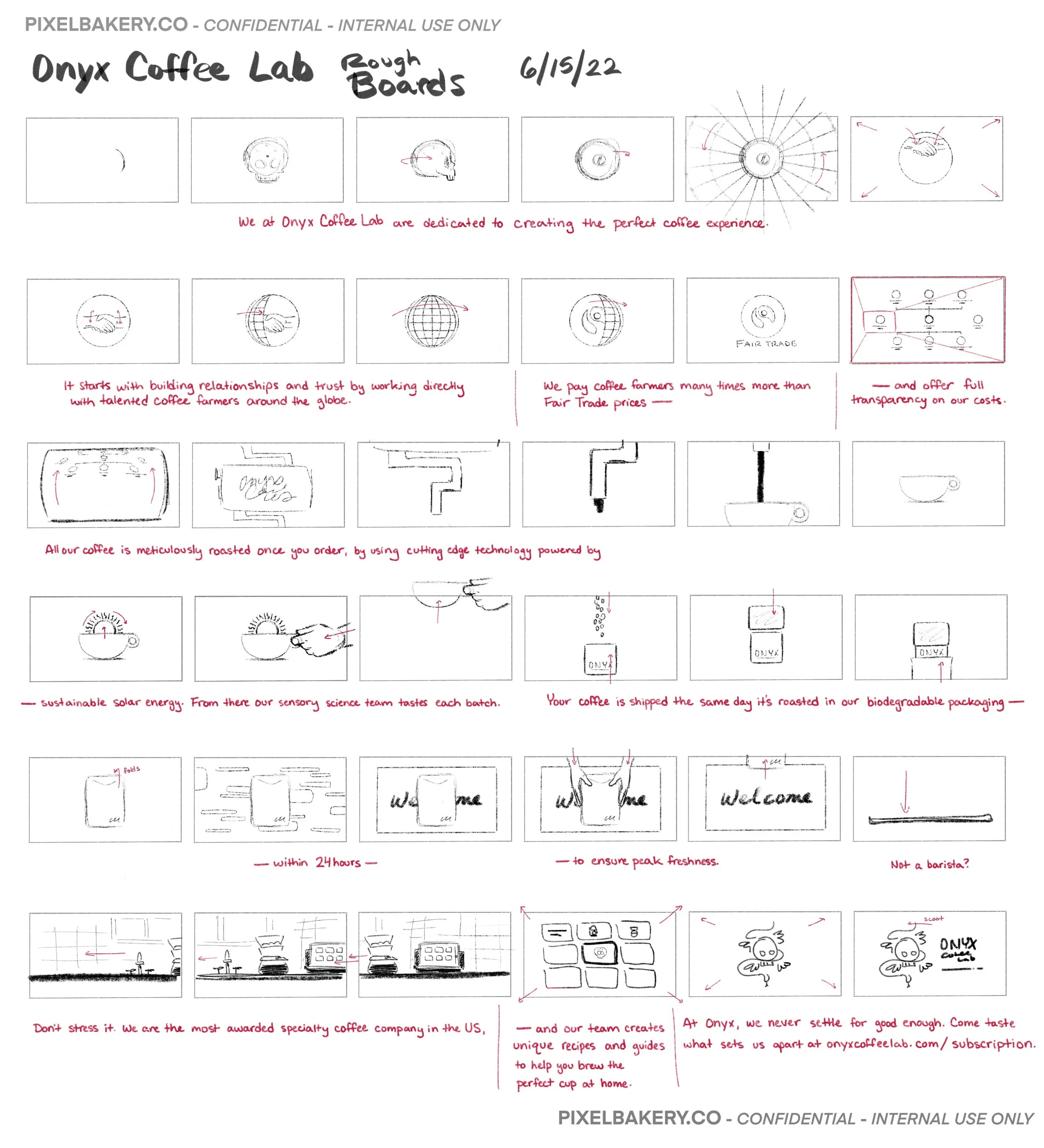 This animation takes the viewer on a journey through Onyx's unique coffee process. In 45-seconds, we outline the major points that set Onyx apart from competitors: quality/excellence in product, transparency, and sustainability. The goal of this project was to increase awareness of Onyx to the mass consumer and drive new coffee subscriptions.